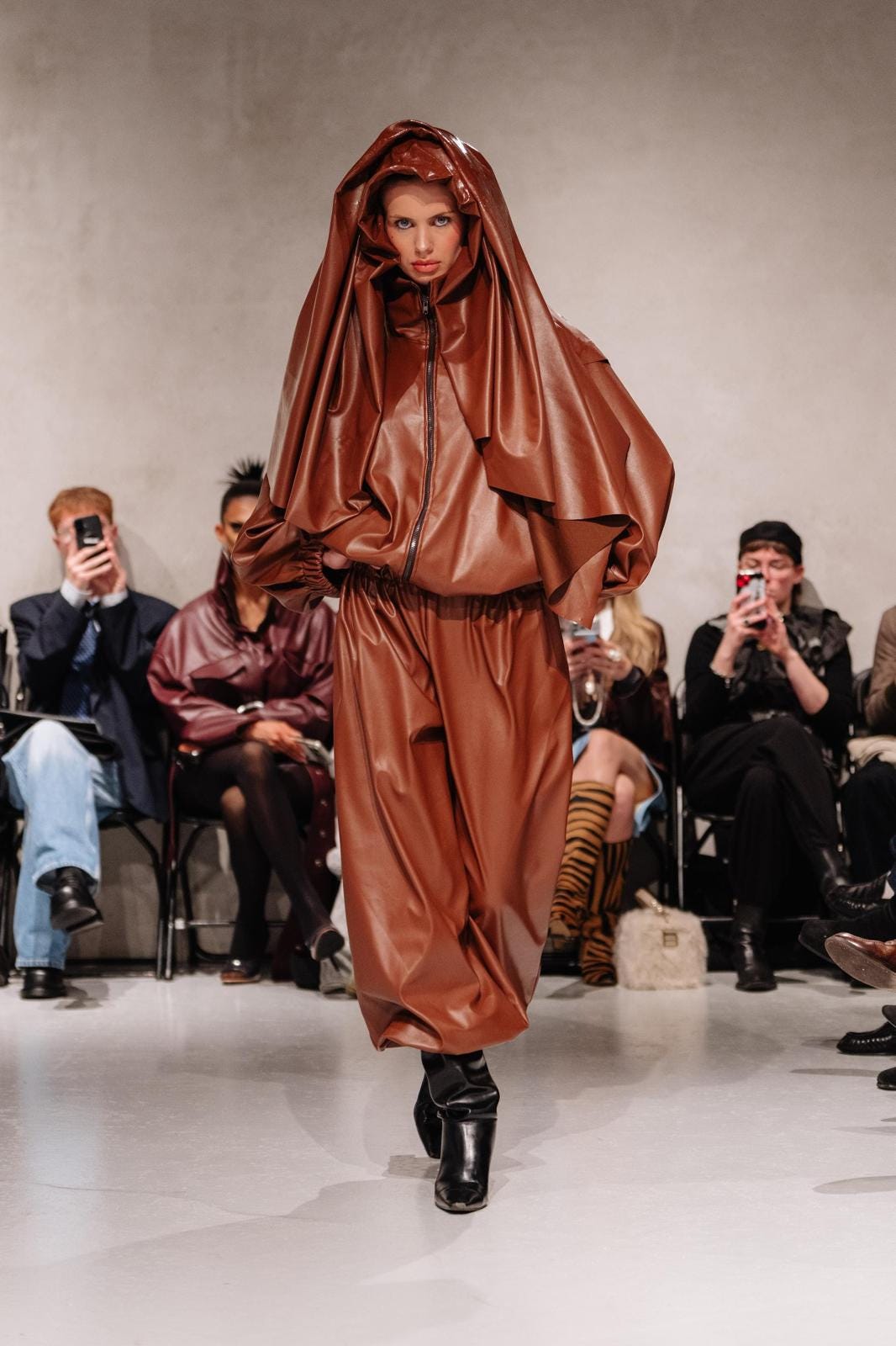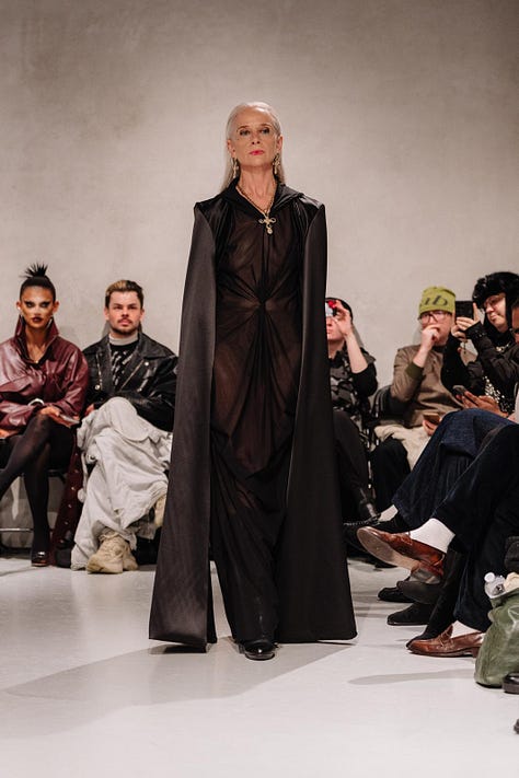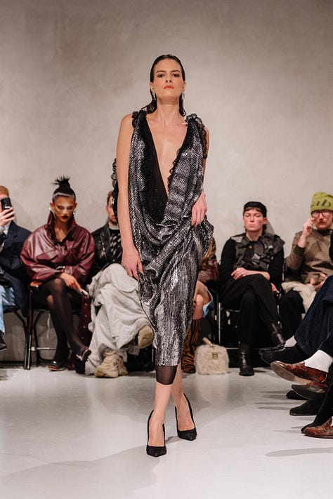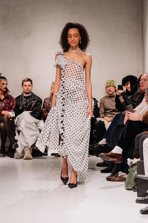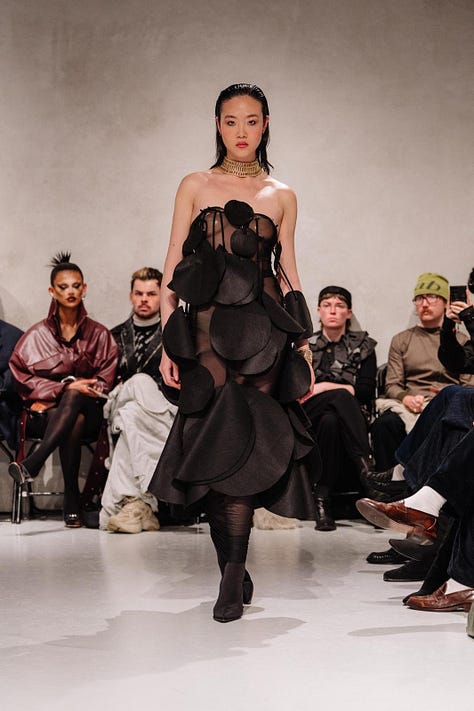 Laciofano’s collection was a powerful statement against our expectations of what fashion should look like, while remaining visually breathtaking. Visceral reactions were evident in the audience, as it was a struggle not to be transfixed by the pieces. The stark contrast between the sheer white curtains and the chromatic designs awakens a sense of fascination. I noted how for every design, there was a unique walk to accompany it. This is a genius idea from Laciofano, as it amplifies the collection's individualistic nature. It felt as though every piece had its own personality; some were more mysterious, and others were brave and bold, allowing the audience to see themselves in his work. The connection between the collection and the designer is one Laciofano doesn’t take for granted.
